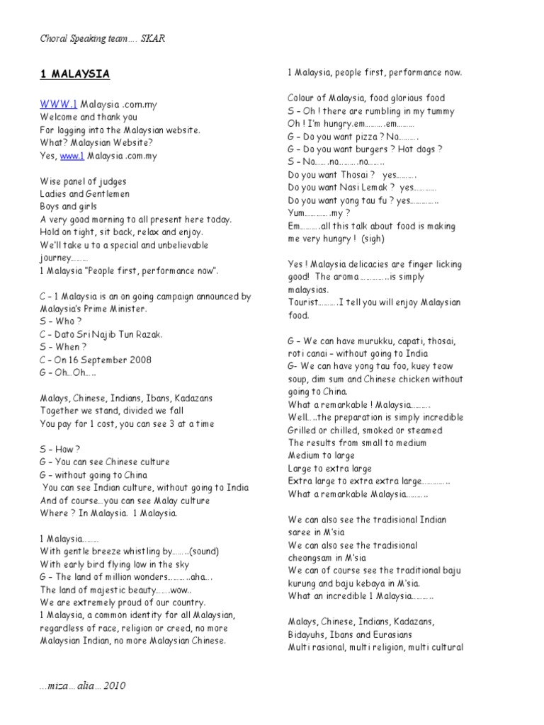 Choral Speaking Script For 1d Malaysia Strait Of Malacca