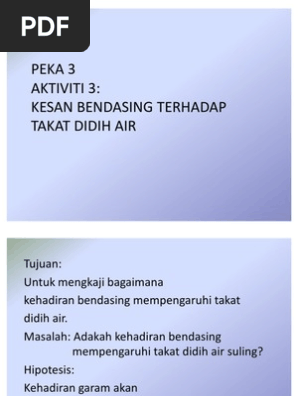 Kesan bendasing terhadap takat didih air. Pijol upc skema rumusan percubaan spm 2016 se malaysia uploaded by. Penyimpangan takat beku dan takat didih air ini daripada suhu yang dijangka boleh dijelaskan oleh ciri kutub molekul air dan ikatan hidrogen yang terbentuk. Suhu c takat beku air air membeku sepenuhnya masa min 0 pepejal cecair cecair air pepejal ais cecair air gas wap 3. Kehadiran garam meningkatkan takat didih air suling pembolehubah.