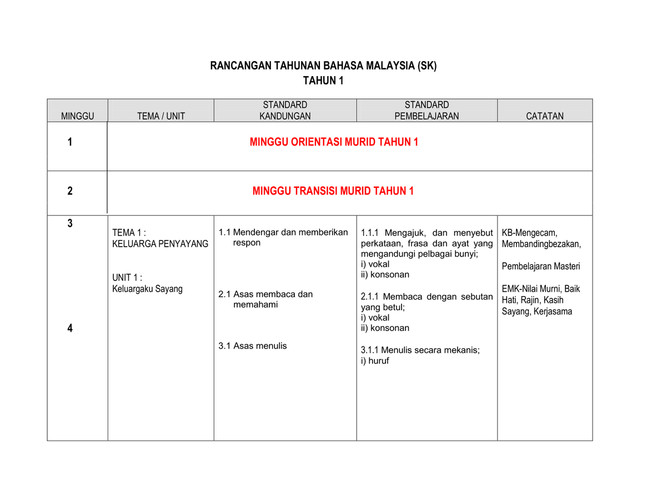 Rpt Tahun 1 Kssr Rancangan Pengajaran Tahunan Tahun 1